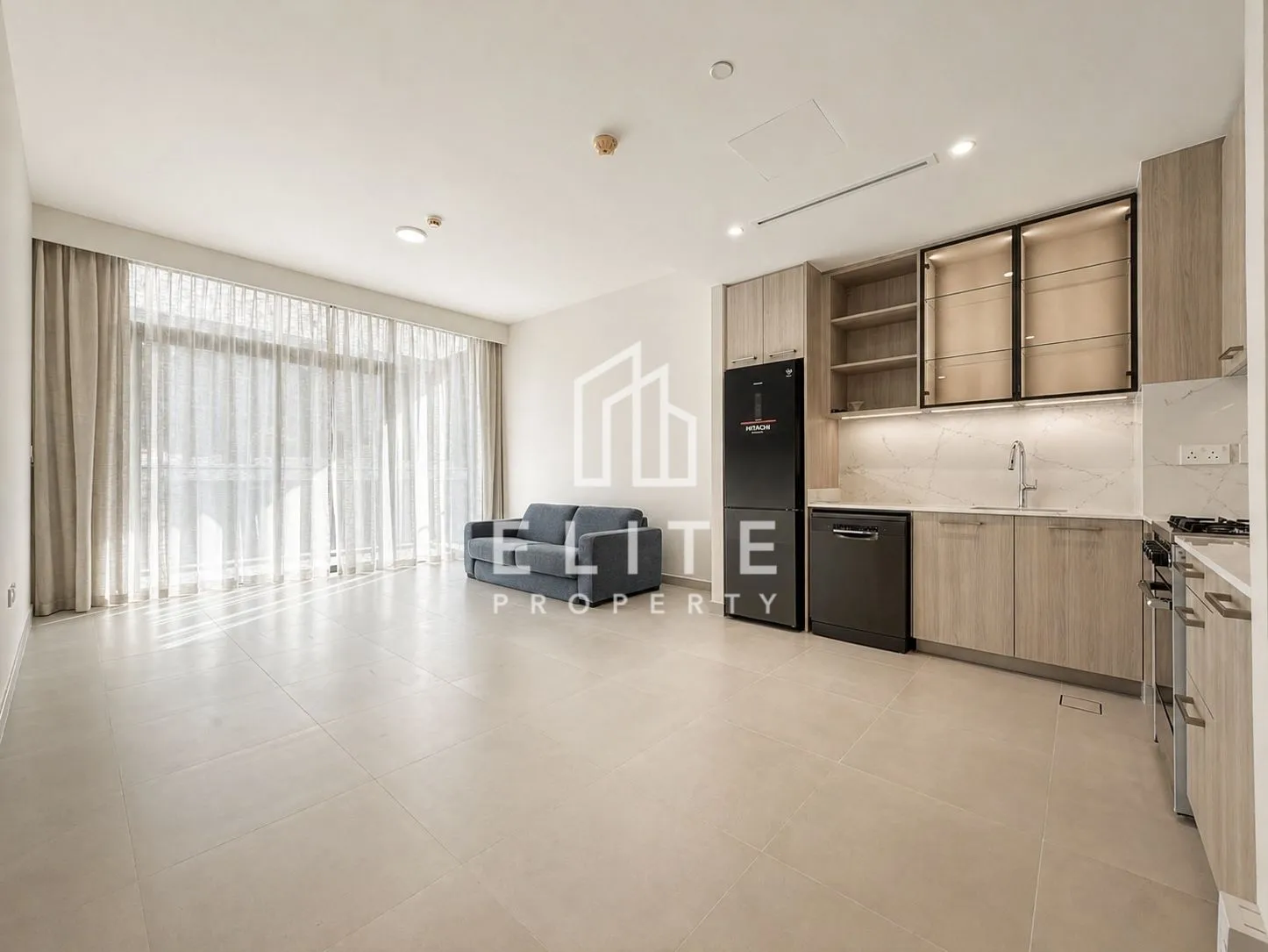 The living space is enhanced with a high quality branded sofa bed and elegant curtains, creating a modern, move in ready home.