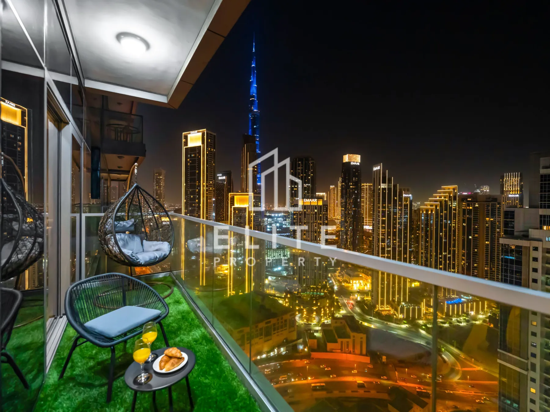- Balcón con vistas al Burj Khalifa y al perfil urbano